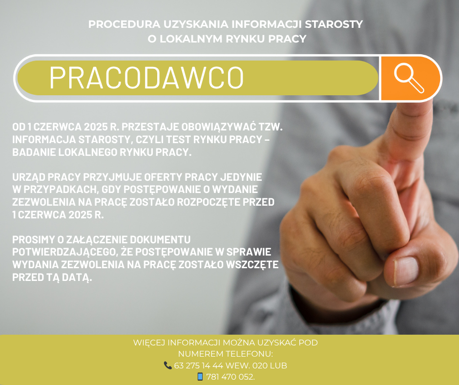 OD 1 CZERWCA 2025 R. PRZESTAJE OBOWIĄZYWAĆ TZW. INFORMACJA STAROSTY, CZYLI TEST RYNKU PRACY – BADANIE LOKALNEGO RYNKU PRACY.