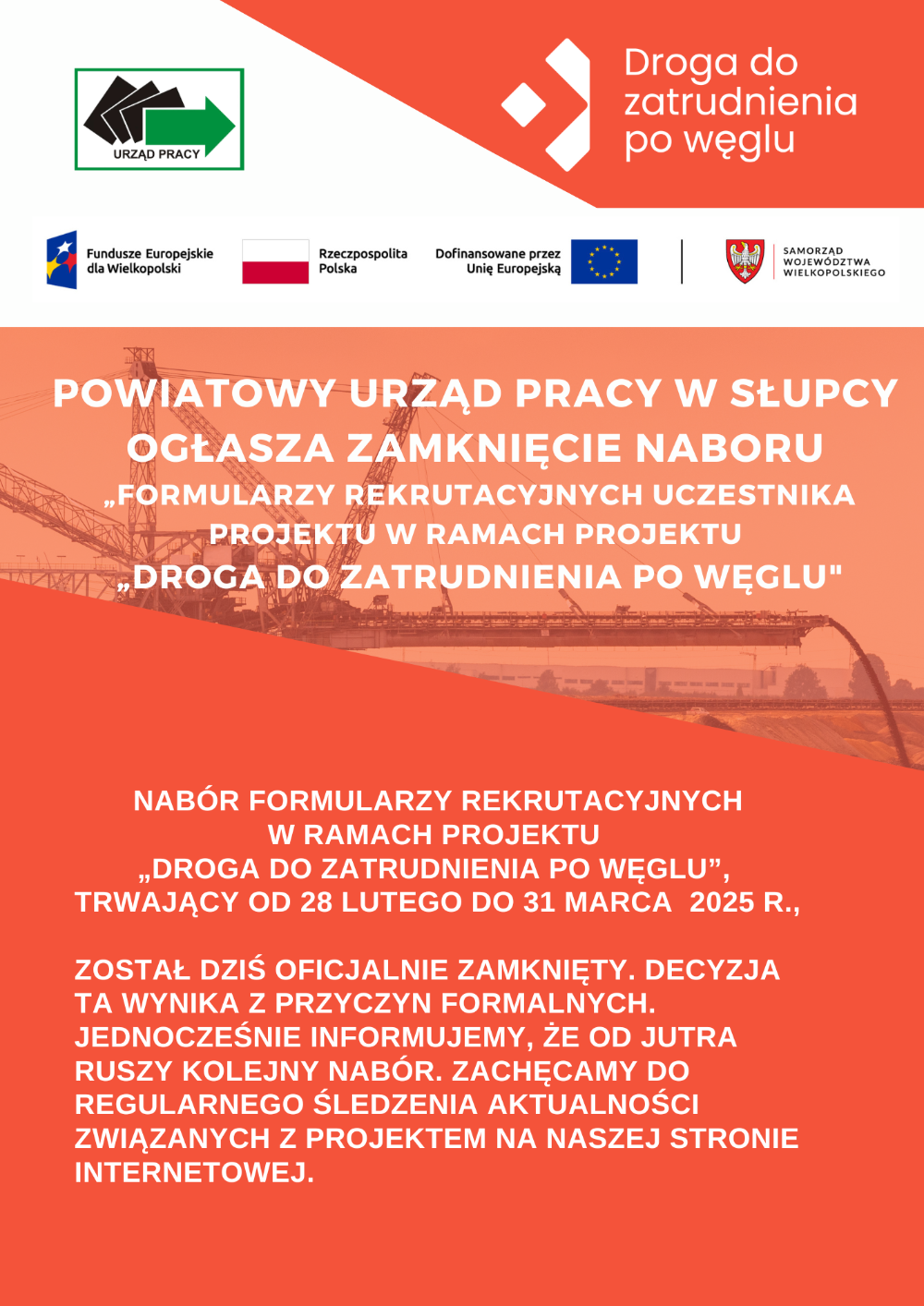 Powiatowy Urząd Pracy w Słupcy ogłasza Zamknięcie naboru „Formularzy rekrutacyjnych Uczestnika Projektu w ramach projektu „Droga do zatrudnienia po węglu".